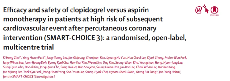 Se realizó un ensayo clínico multicéntrico en Corea del Sur, en 5506 pacientes de alto riesgo que habían completado doble antiagregación plaquetaria (DAP) tras colocación de stents farmacológicos. Los pacientes fueron aleatorizados a recibir monoterapia con clopidogrel (75 mg/día) o aspirina (100 mg/día), con un seguimiento medio de 2,3 años